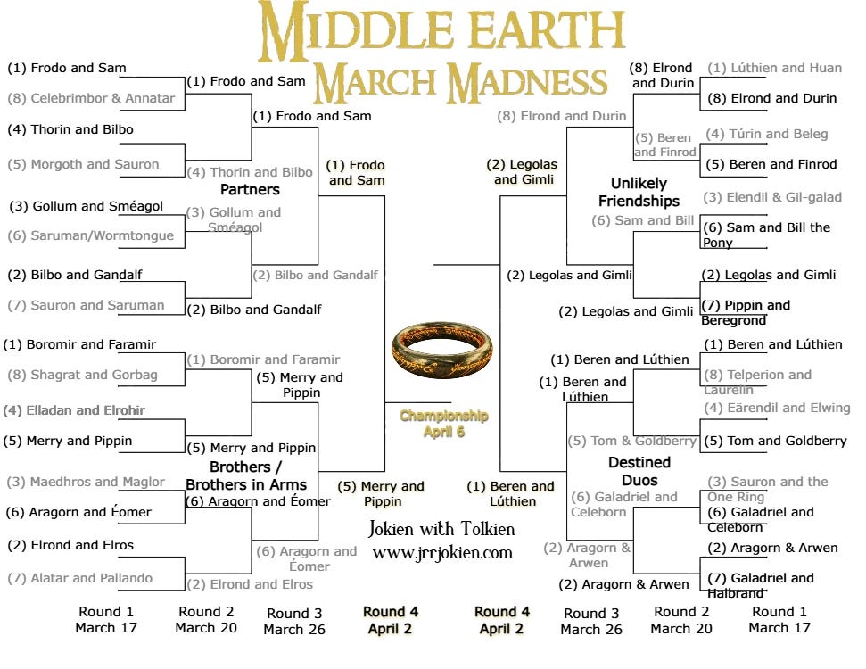 Characters from all across Middle-earth have faced off in the first few rounds of Middle-earth March Madness. And what was once a group of 32 contestants has narrowed to the Company of 16 and then again to the Fellowship of the 8!