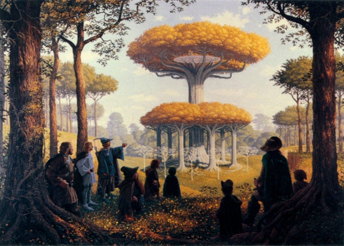 As the Fellowship continues on through the forest, Legolas and Aragorn express the gladness they feel that they will soon see the golden trees of LothlĂłrien.