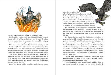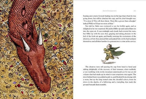 The Hobbit Illustrated by Jemima Catlin is the version that I just read to my boys. All of us adore it and I am excited to share it with you all. The hardcover book contains numerous illustrations in a style that perfectly fits the book and the age of the intended audience. I love the mix of full-page illustrations and smaller illustrations that are peppered throughout!